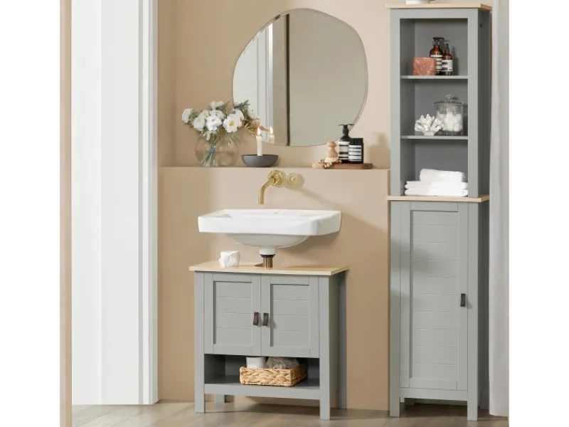 Der Waschbeckenunterschrank mit Ablagen bietet ausreichend Platz für Badutensilien.