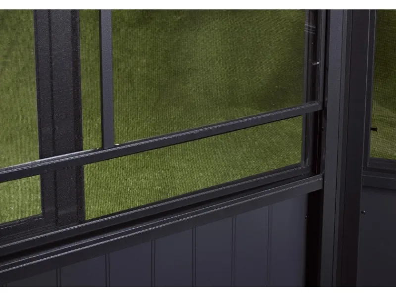 Kontrollierbare Durchlüftung durch Fenster (eins in jedem Wandelement) bestehend aus je einem Moskitonetz sowie einem reißfesten PVC-Folien-Fenster, welches zur Durchlüftung einfach nach unten geschoben und mit zwei Handgriffen zum Reinigen herausgenommen wird. Auch die Wände bestehen aus PVC-Folie.