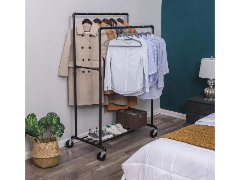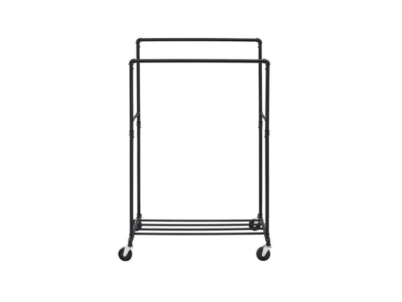 Zwei Stangen bieten mehr Platz zum Aufhängen Ihrer Kleidung, mit 44 cm Abstand zwischen den Stangen ist die Kleidung leicht zugänglich. Hängen Sie Schals und Krawatten an die Stangen und stellen Sie Schuhe auf die Ablagen unten. Eine Doppelkleiderstange auf Rollen mit 2 Stangen, gekennzeichneten Einzelteilen und einer klaren Anleitung für eine einfache Montage.