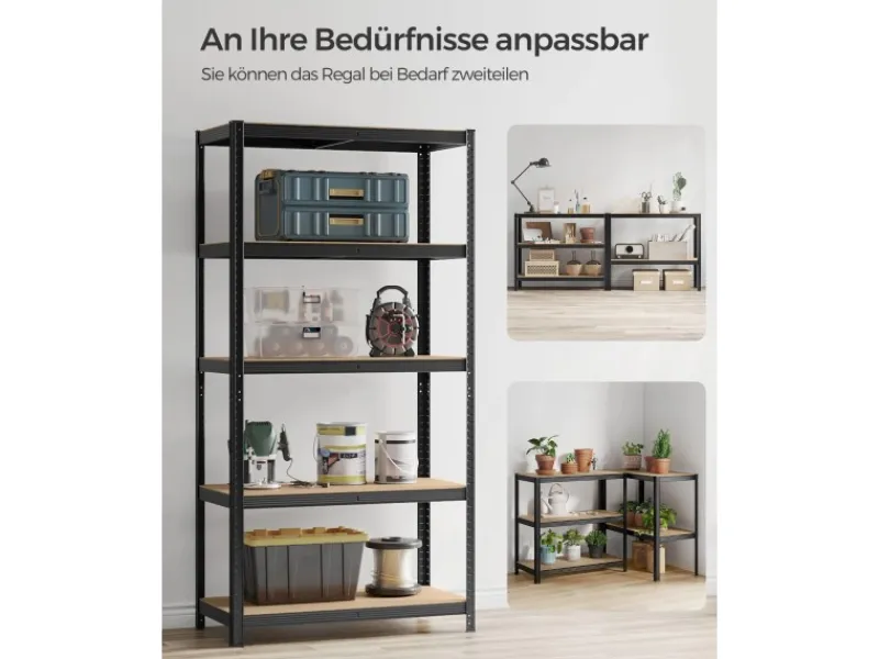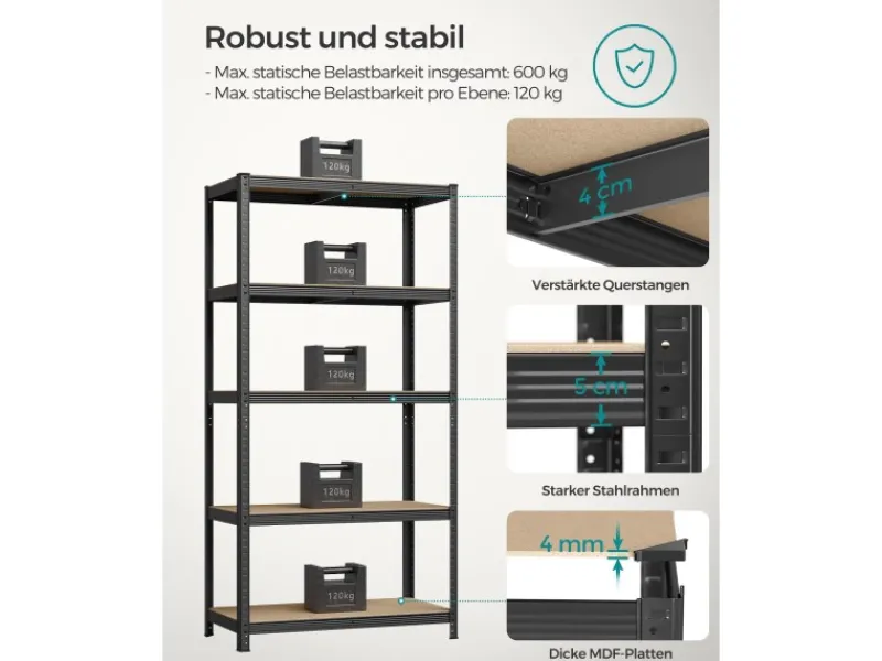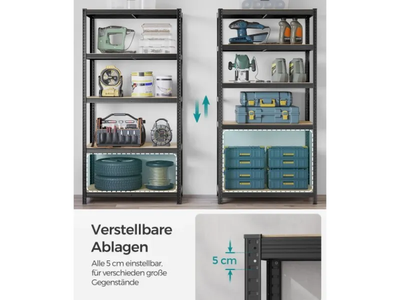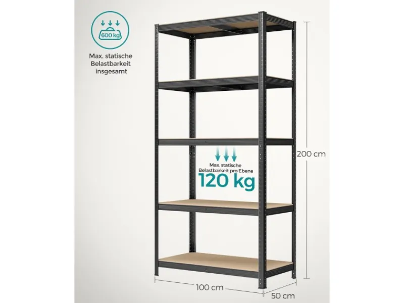 Alle Ablagen können um 5 cm verstellt und durch integrierte Steckplätze angebracht werden, sodass auch große Gegenstände hineingelegt werden können. Dieses Regal mit einer Größe von 50 x 100 x 200 cm ist bis zu 600 kg belastbar.