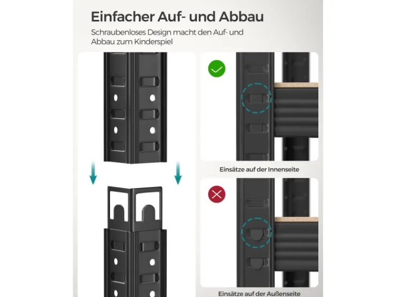 Sie können es in der Garage, im Lagerraum oder Keller verwenden, um alle Ihre Werkzeuge und Geräte zu organisieren. Dank der ineinandergreifenden Ablagen und der klaren Anleitung können Sie dieses multifunktionale Regal schnell zusammenbauen.