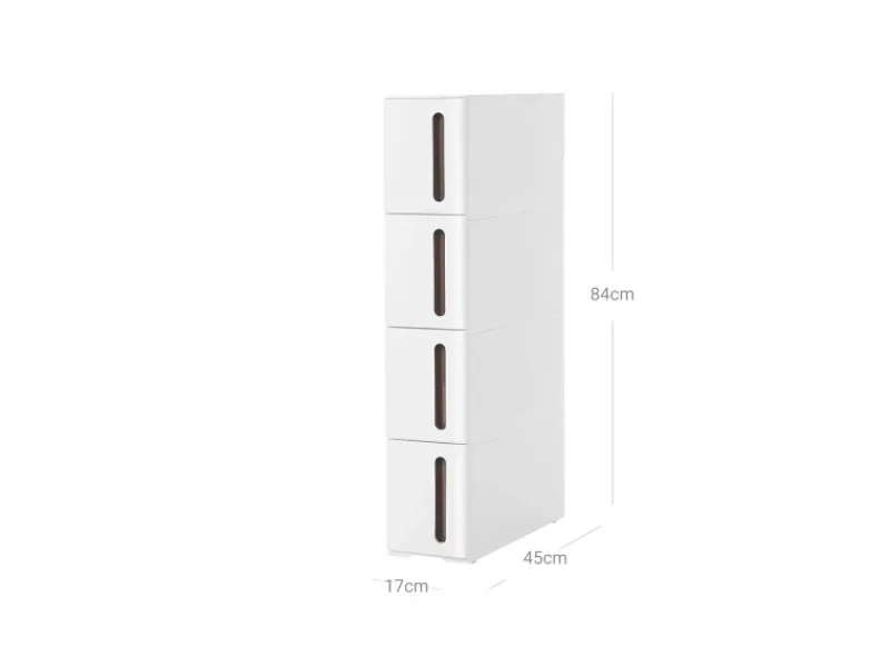 Einen schmalen Rollwagen mit 4 geräumigen Schubladen und 4 Rädern sowie eine Möglichkeit, zusätzlichen Stauraum in Ihrem Wohnzimmer, Badezimmer oder in Ihrer Küche zu schaffen.