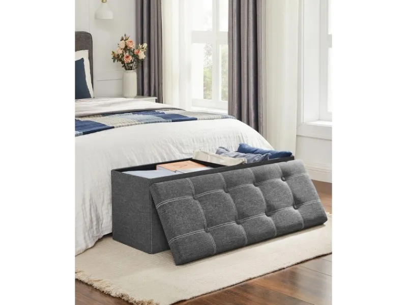 Diese Sitzbank besteht aus robusten und langlebigen MDF-Platten und ist bis 300 kg belastbar. Füße entspannt hochlegen? Schuhe ausziehen? Nur zu! Bei Nichtgebrauch können Sie diese Truhe einfach zusammenklappen und in einer Ecke verstauen.