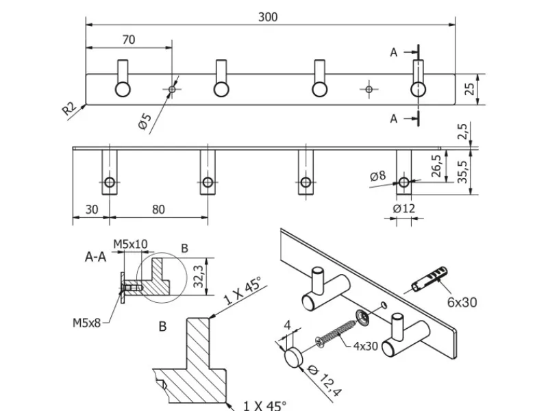 Abmessungen – Gesamtlänge 300 mm / Höhe 25 mm / Tiefe 38 mm / Haken-Ø 12 mm