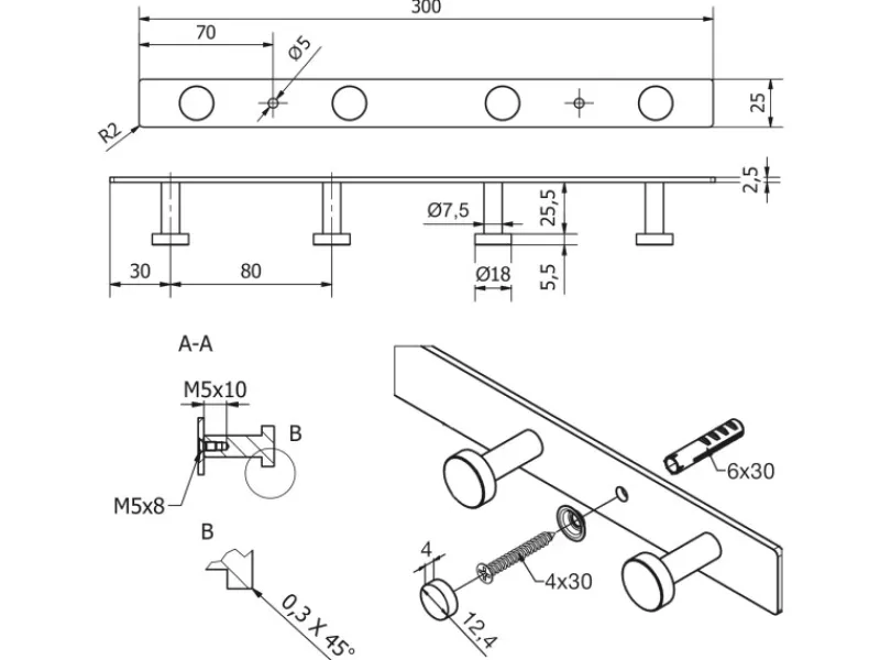 Abmessungen – Gesamtlänge 300 mm / Höhe 25 mm / Tiefe 38 mm / Haken-Ø 12 mm