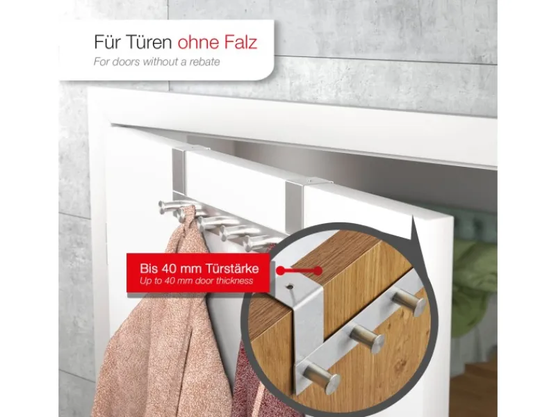 Ob Zimmer- oder Schranktüren mit einer Türblattstärke von bis zu 40 mm, die Linea II lässt sich mühelos über die Tür hängen. Sie wurde speziell für Türen ohne Falz entwickelt und kann nach dem Einhängen fixiert werden, um ein Verrutschen zu vermeiden. Die Linea II von SOTECH – elegante Ordnung für Ihr Zuhause!