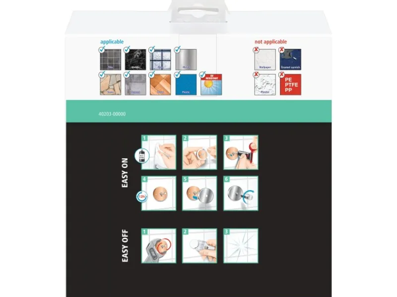 Der Artikel lässt sich ganz einfach und sauber ohne Bohren und Schrauben an der Wand befestigen. Nachdem Sie den Befestigungsadapter angebracht und mit der im Lieferumfang enthaltenen Klebmasse gefüllt haben, warten Sie 12 Stunden und können den Artikel dann dauerhaft sicher anbringen. Zum beiliegenden Befestigungsset gehören ein Befestigungsadapter und die Klebmasse. Der Artikel eignet sich zu Anbringung auf Fliesen, Metall, Naturstein, Marmor, Glas, Holz und vielen Kunststoffen. Sie können den Duschkorb jederzeit wieder entfernen und mit einem neuen Adapter (BK43-2) sogar wiederverwenden. Ihre Fliesen bleiben dabei stets unbeschädigt.