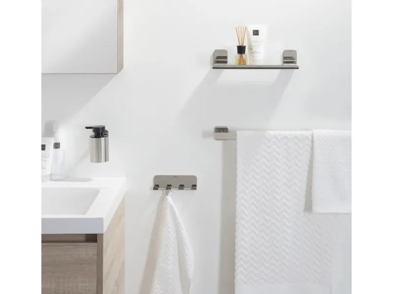 Die Serie Colar bietet modernes Design gepaart mit Funktionalität. Die praktische Hakenleiste in Edelstahl gebürstet mit 4 Haken lässt sich einfach mit Hilfe der rückseitigen Klebefolie an der Wand befestigen.