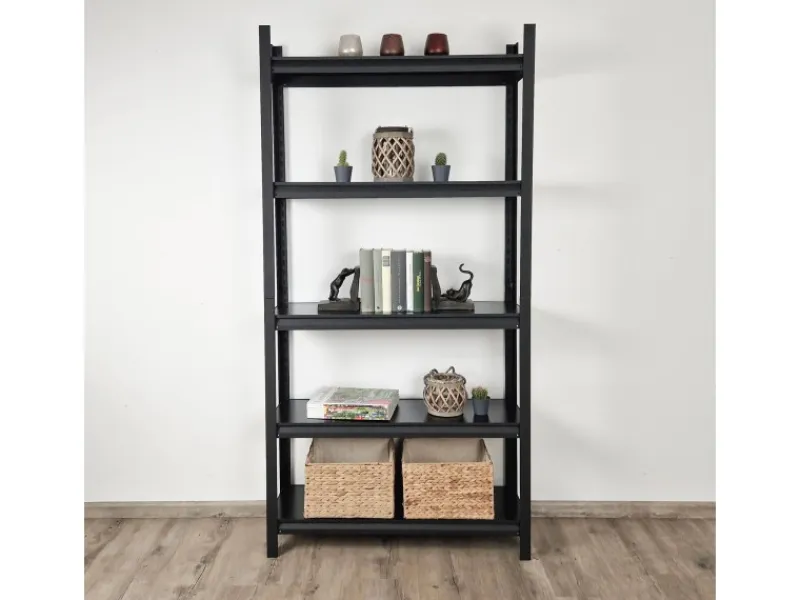 Eigenschaften: Maße (HxBxT): 180x90x30 cm Gewicht des Regals: ca. 18 kg Traglast je Boden: Max. 120 kg Gesamttraglast: Max. 600 kg 5 Böden aus MDF-Holz in schwarz Stärke der Böden 8 mm Je höher die Belastung auf dem Boden wird, um so fester wird die Steckverbindung Verstecktes Schlüsselloch-Stecksystem (Montage ohne Schrauben) Robustes, pulverbeschichtetes Stahlgestell in schwarz-matt Bohrungen an den Pfosten für Befestigung an der Wand vorhanden