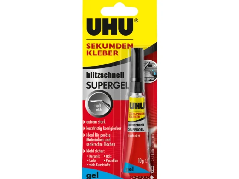 Der Uhu Sekundenkleber Supergel eignet sich für Metall, Porzellan, Holz, Keramik, Leder, Kork, Filz, Stoff, viele Kunststoffe (z.B. Hart-PVC, ABS, PS, Plexiglas®, Polycarbonat (Makrolon®), Phenolharz (Bakelite®)) und Gummi. Nur teilweise geeignet für Glas (nach einer gewissen Zeit wird die Klebeverbindung brüchig und verliert an Festigkeit).