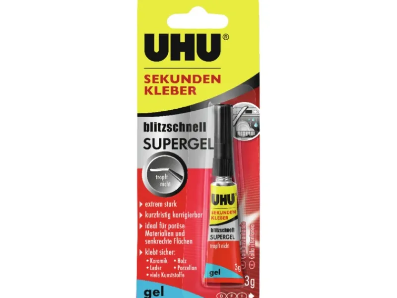 Der Uhu Sekundenkleber Supergel eignet sich für Metall, Porzellan, Holz, Keramik, Leder, Kork, Filz, Stoff, viele Kunststoffe (z.B. Hart-PVC, ABS, PS, Plexiglas®, Polycarbonat (Makrolon®), Phenolharz (Bakelite®)) und Gummi. Nur teilweise geeignet für Glas (nach einer gewissen Zeit wird die Klebeverbindung brüchig und verliert an Festigkeit).