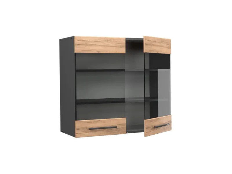 Die Hängevitrine hat Breite 80 cm, Höhe 72 cm und Tiefe 34,1 cm