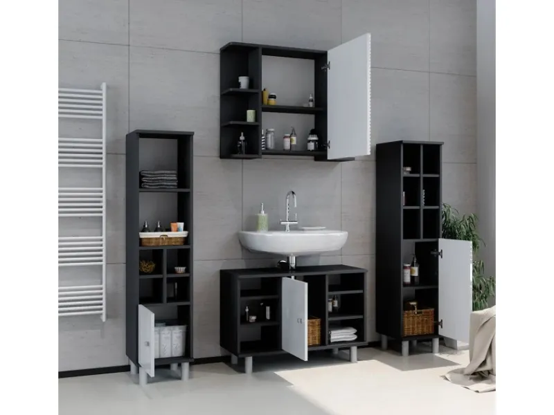 Der Badschrank besteht aus pflegeleichter Spanplatte 16 mm, mit einer Melaminharzbeschichtung
