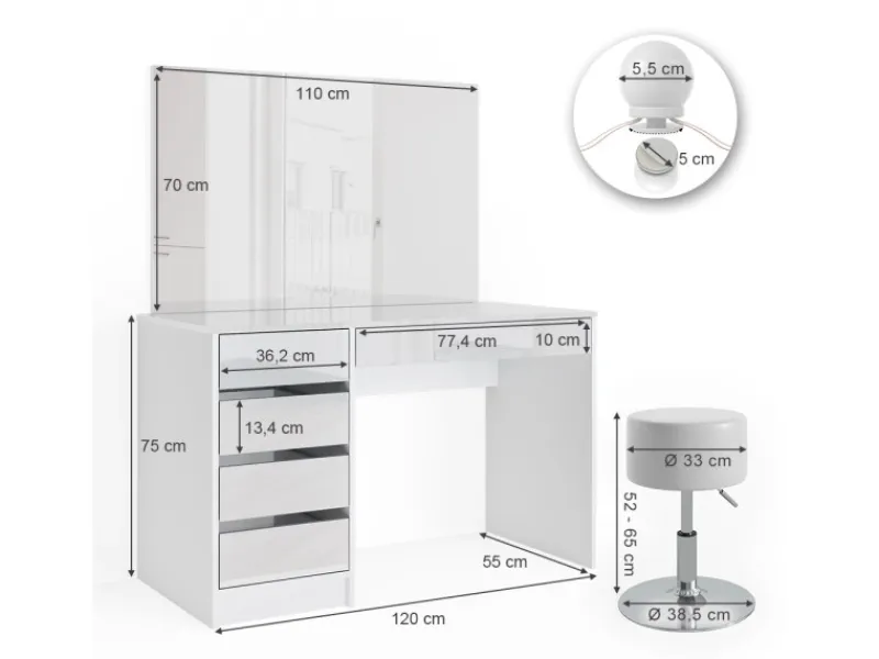 Der Schminktisch hat eine Breite von 120 cm, eine Höhe von 75 cm und eine Tiefe von 55 cm