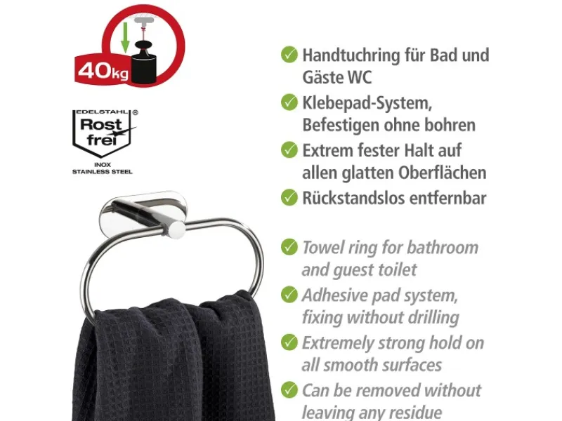Der praktische Handtuchring Orea ist flexibel nach oben und unten beweglich. Der ovale Handtuchhalter eignet sich ideal zum Aufhängen von Handtüchern und hält sie stets griffbereit. Passend zu diesem Accessoire sind viele weitere Artikel der Serie Turbo-Loc Orea von Wenko erhältlich.