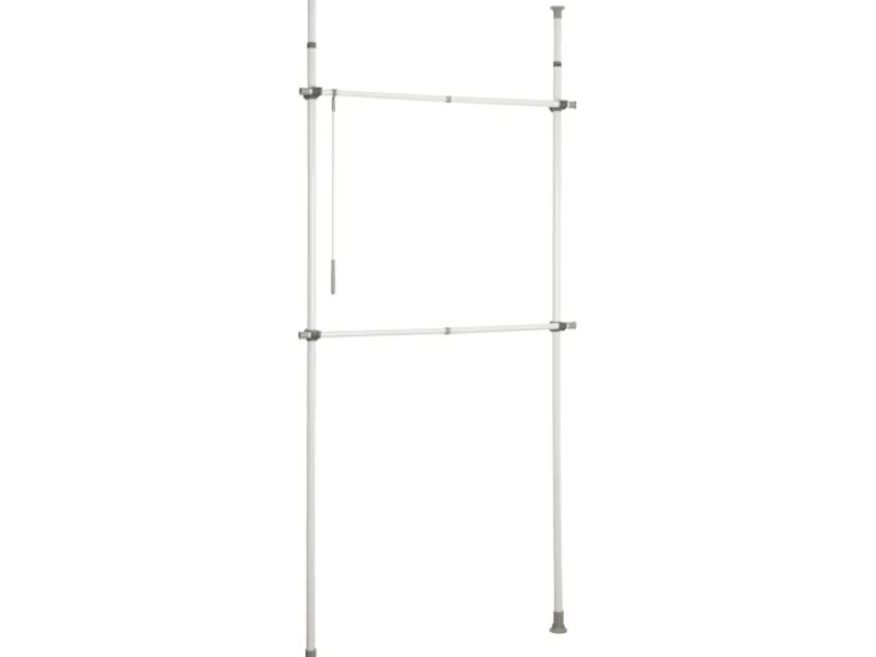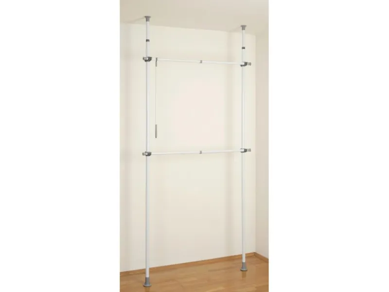 Die Trägerstangen lassen sich in der Höhe von 165-300 cm teleskopisch ausziehen. In der Breite ist das System von 75-120 cm an den Raum anpassbar. Mit dem mitgelieferten Kleiderhaken können auch höher hängende Kleidungsstücke einfach und schnell erreicht werden.