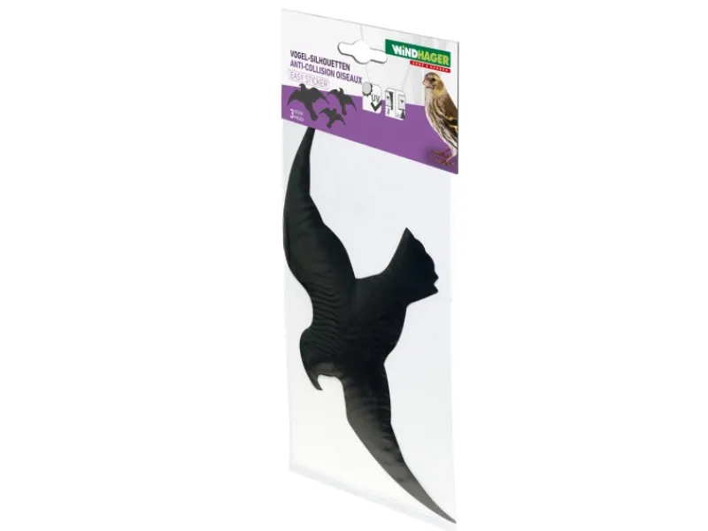 Die selbstklebende Folie ist UV- sowie witterungsbeständig und ist somit für den Einsatz rund um das Jahr geeignet. In der Packung befinden sich drei Stück Vogel-Silhouetten in unterschiedlichen Größen. Die Sticker sind selbstklebend und sofort einsatzbereit. Sie können die Folie sowohl in Innen- als auch in Außenbereichen anbringen und nach Wunsch wieder ganz einfach entfernen. Die Vogelsticker sind zur Anwendung auf Fensterscheiben, Wintergärten, Lärmschutzwänden und anderen Glas- oder Spiegelflächen geeignet.