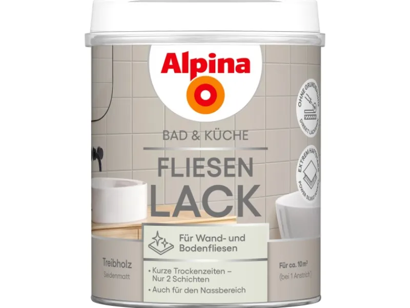 Der stilvolle Farbton Treibholz verleiht Ihren Räumen eine harmonische Optik. Kombinieren Sie den Fliesen-Lack ideal mit Alpina Wandfarben und Möbel-Lacken aus der Bad & Küche-Produktlinie, um ein stimmiges und individuelles Raumkonzept zu schaffen.