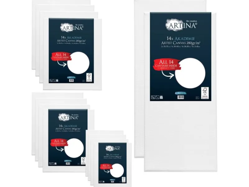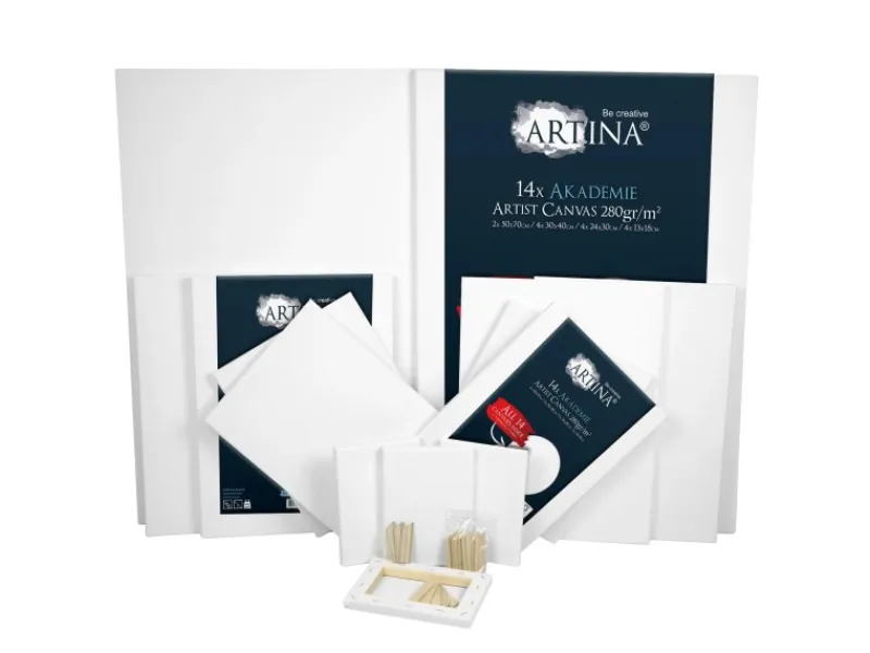 Artina Akademie 14er Keilrahmen Set Die 14er Sets Keilrahmen der Serie Akademie von Artina sind besonders für den Anfänger im Bereich des Malens gedacht, jedoch sind auch Fortgeschrittene, Hobbyisten und Profis mit dieser Malunterlage sehr zufrieden. Leinwand aus 100% Baumwolle Die 280g/m² schwere Leinwand besteht aus 100% Baumwolle, ist 2-fach weiß vorgrundiert und säurefrei behandelt. Auf der leicht saugenden Oberfläche bleiben die Farben besonders gut haften und ein Ablösen wird verhindert. Holzrahmen mit Holzleisten Auf dem Holzrahmen ist die Leinwand umlaufend geheftet und kann bei Bedarf mit den 8 beiliegenden Holzkeilen nachgespannt werden. Für einen stabilen Halt der Malunterlage sorgen 1,7cm starke und 2,5cm breite Holzleisten. Lieferumfang: 2x 50x70cm 4x 30x40cm 4x 24x30cm 4x 13x18cm Produktdetails: Material Leinwand: 100% Baumwolle Grammatur Leinwand: 280g/m² Grundierung Leinwand: 2-fach weiß vorgrundiert – säurefrei behandelt Oberfläche Leinwand: mittlere, gleichmäßige Gewebestruktur – leicht saugend, feinstrukturiert und strapazierfähig