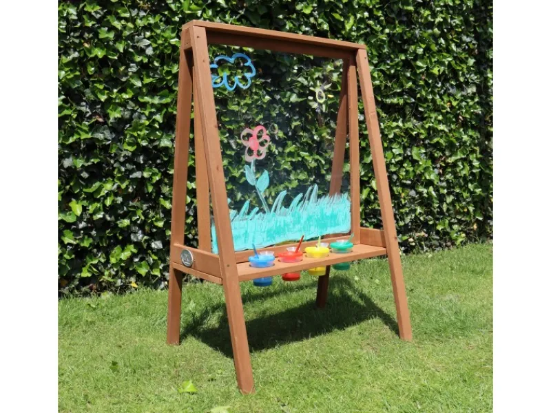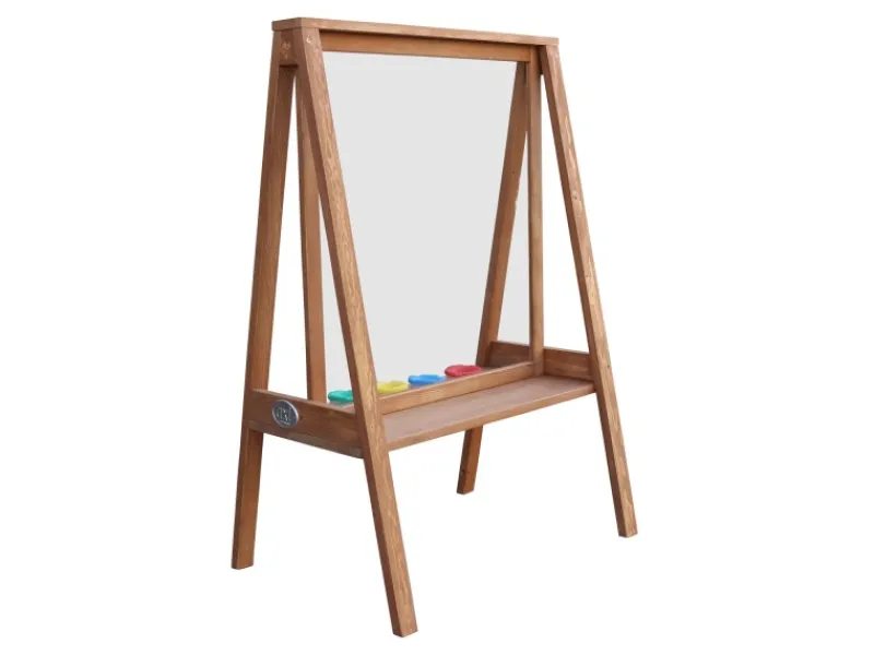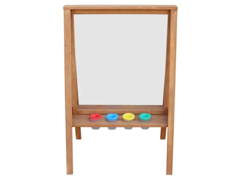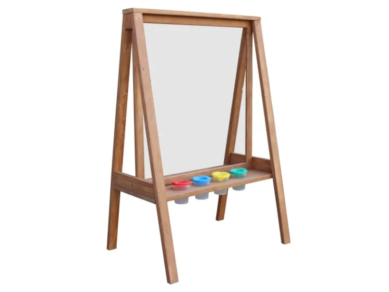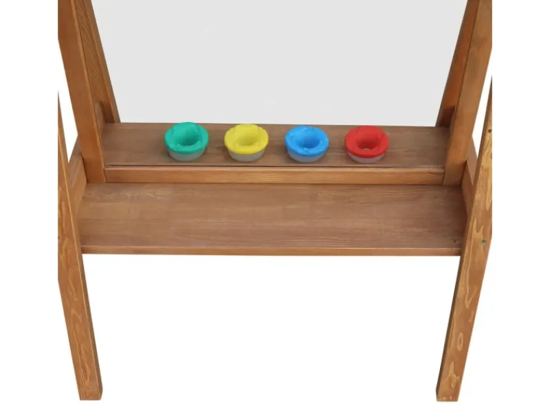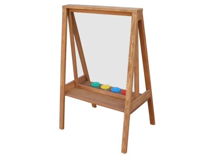Die Staffelei verfügt über eine leicht zu reinigende Plexiglas-Leinwand, die es ermöglicht, dass Kinder an beiden Seiten gleichzeitig spielen können. Zudem bietet die Staffelei vier farbige Fächer und eine Ablagefläche für alle Zeichenutensilien, damit alles sauber und ordentlich bleibt.