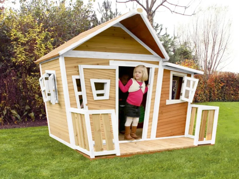 AXI-Spielhäuser bestehen aus vormontierten (Prefab) Paneelen, wobei die möglichen Fenster und Türen vormontiert sind. Die Teile sind in der Regel vorgebohrt, so dass das Haus im Handumdrehen aufgebaut werden kann.
