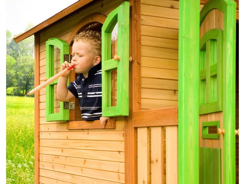Das Kinderhaus hat insgesamt 4 Fenster und ein Bullauge, wodurch ausreichend Licht in das Haus gelangt. Die Fenster lassen sich komplett öffnen, dadurch können Ihre Kleinen von überall hinaus schauen. Die große Eingangstür ermöglicht einen einfachen Zugang in das Haus. Auch ein Fußboden ist im Lieferumfang enthalten.