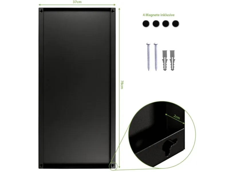 Die Magnet Pinnwand besteht aus schwarz lackiertem Stahl mit einer Aufhänung auf der Rückseite