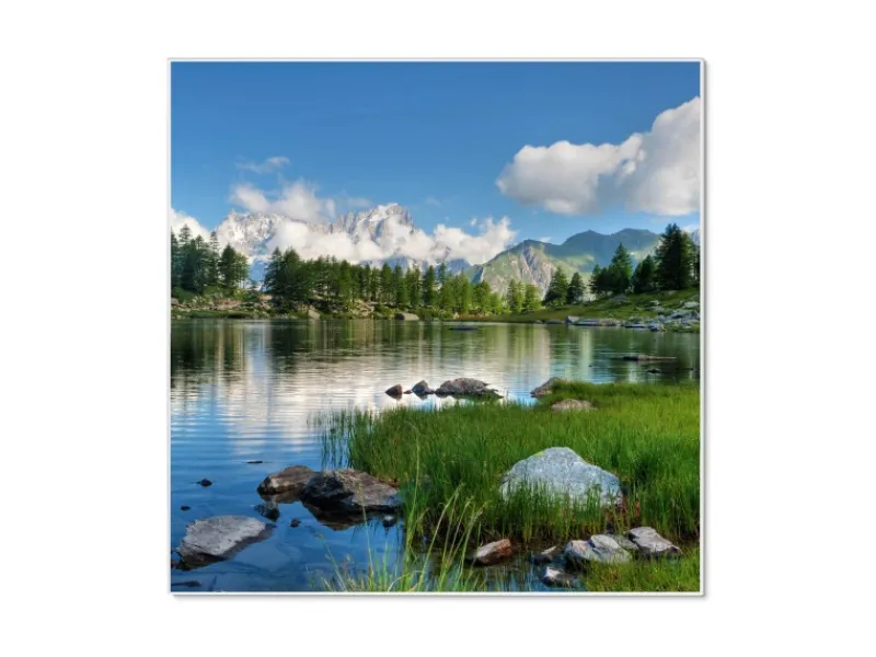 Das Motiv Gebirgssee wird mit einem Schutzlaminat überzogen und ist lösungsmittelfrei.