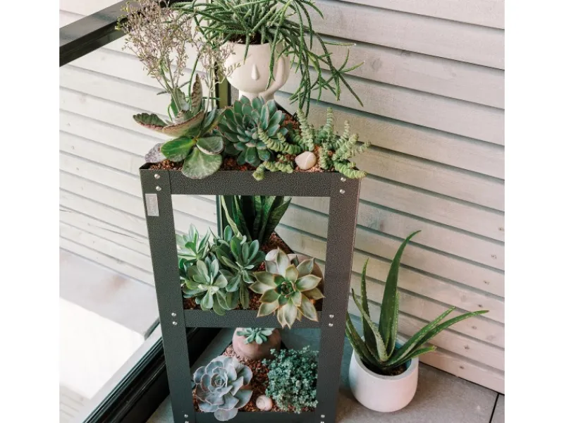 Ob klein oder hoch, ob eng oder weit – Triangolo passt sich an veränderte Platzverhältnisse an. Das Pflanzregal lässt sich dank einfachem Stecksystem mit einem weiteren Regal bis zu einer Höhe von 140 cm erweitern. Die Böden des Pflanzregals können Sie beidseitig einsetzen und wahlweise eine vertiefte Fläche oder eine flache Oberfläche nutzen. So können Sie das Regal beispielsweise auch als kleinen Steingarten anlegen und mit Sukkulenten bepflanzen.