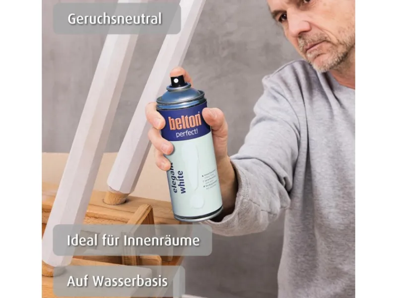 Der Lackspray ist eine Sprühfarbe auf Wasserbasis, die geruchsneutral ist und somit auch problemlos im Innenbereich verwendet werden kann. Sie ist hochpigmentiert, was für eine hohe Farbintensität und Deckkraft sorgt. Diese Farbe ist sowohl für den Innen- als auch Außenbereich geeignet, da sie witterungs- und UV-beständig ist. Der Farbverlauf bleibt samtig in einer seidenmatten Optik. Dank der einfachen Handhabung liefert belton Buntlack Perfect überzeugende Ergebnisse. Sie kann auf zahlreichen Untergründen wie Eisenmetallen, Holz, Ton, Stein, Papier, Styropor und lackierbaren Kunststoffen direkt angewendet werden. Für saugende und behandelte Holzflächen, verzinkten Stahl, Aluminium, Keramik und NE-Metalle ist die Verwendung einer Grundierung notwendig. Bei Kunststoffen sollte die Verträglichkeit geprüft und gegebenenfalls mit belton Kunststoff-Grundierung vorbehandelt werden. Die feine Zerstäubung sorgt für ein gleichmäßiges Sprühen, während die Farbe schnell trocknet und für Kinderspielzeug geeignet ist.