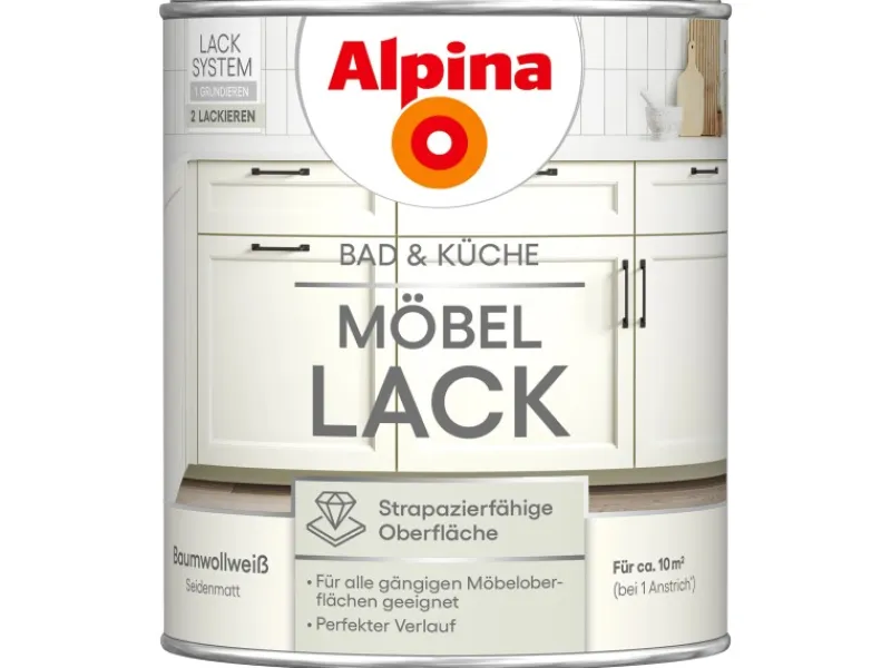 Nach der Grundierung mit Alpina Möbel-Grund Bad & Küche kann der Möbel-Lack auf nahezu allen gängigen Möbeloberflächen verwendet werden.