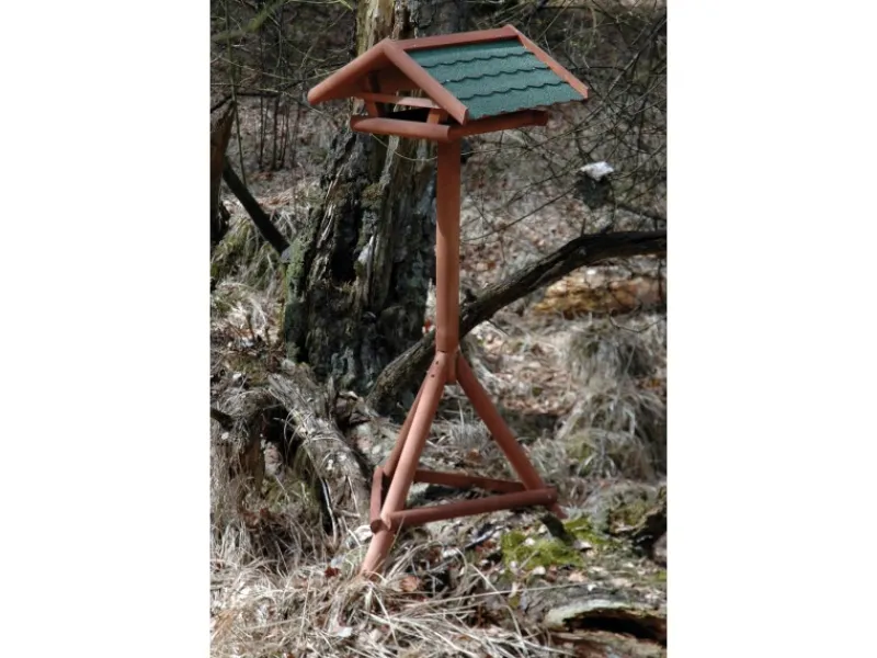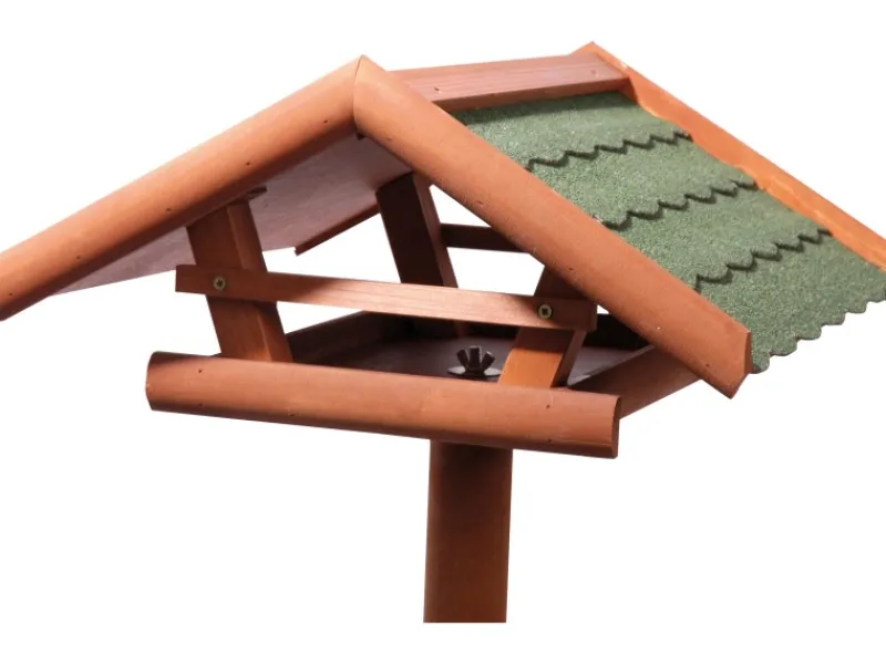 Vogelfutter aus aus imprägniertem FSC Nadelholz mit Bitumendach. Inklusive Ständer