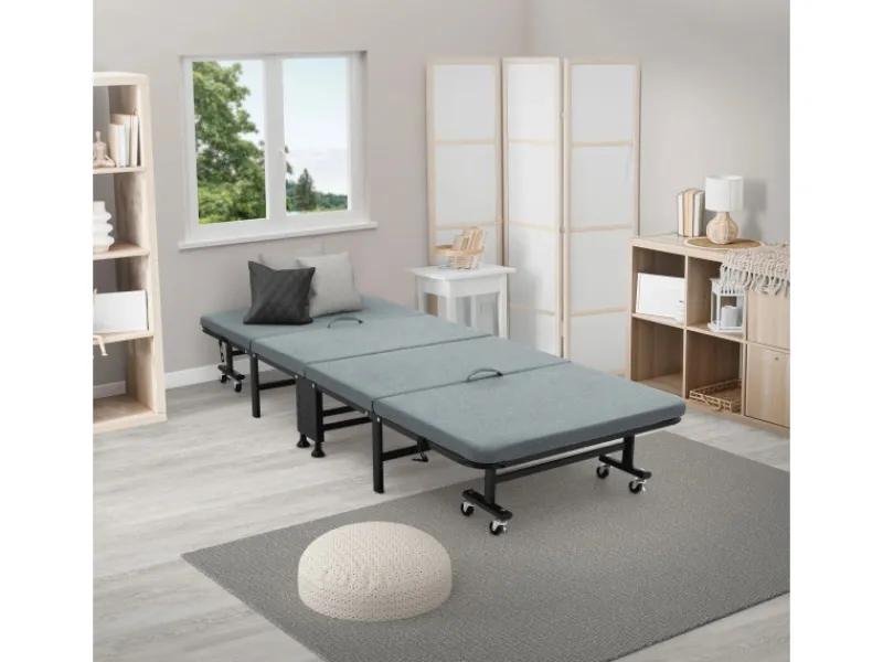 Du suchst nach einer praktischen und komfortablen Lösung für Gäste? Dieses klappbare Gästebett mit den Maßen 90 x 200 cm ist genau das Richtige für dich. Es ist schnell einsatzbereit, da die Polsterelemente bereits fixiert sind, und lässt sich platzsparend zusammenklappen. Mit den Klickverschlüssen bleibt das Bett im geschlossenen Zustand sicher fixiert. Dank des stabilen Stahlgestells und der insgesamt 8 Rollen (davon 4 mit Feststellbremsen) kannst du es einfach transportieren und sicher abstellen. Ein passendes Cover für den zusammengeklappten Zustand ist im Lieferumfang enthalten – so bleibt das Bett auch bei längerer Lagerung geschützt.