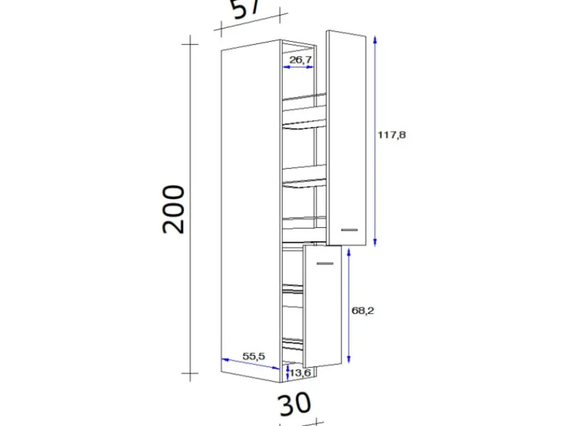 Der Küchenhochschrank bietet mit einer Höhe von 200 cm, einer Breite von 30 cm und einer Tiefe von 57 cm ein Maximum an Verstaumöglichkeiten auf kleinstem Raum. Er verfügt über zwei Auszüge und insgesamt fünf Ablagen und sorgt für Ordnung und Übersichtlichkeit in Ihrer Küche. Hier finden Essig und Öl, Vorratsdosen, Konserven oder Geschirr einen idealen Platz und sind stets griffbereit. Der Apothekerschrank lässt sich optimal mit allen Küchenmöbeln aus der Flex-Well Classic Serie Wito kombinieren.