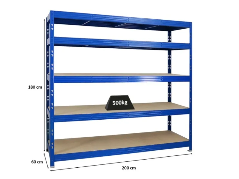 Das Schwerlastregal ist 180 cm hoch, 200 cm breit und 60 cm tief. Die Farbe ist Blau