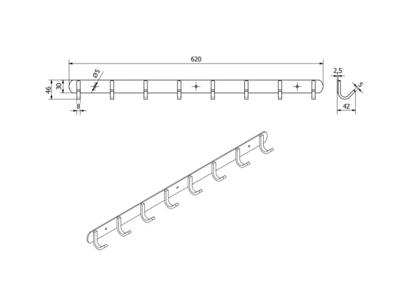 Abmessungen – Gesamtlänge 300 mm / Höhe 25 mm / Tiefe 38 mm / Haken-Ø 12 mm