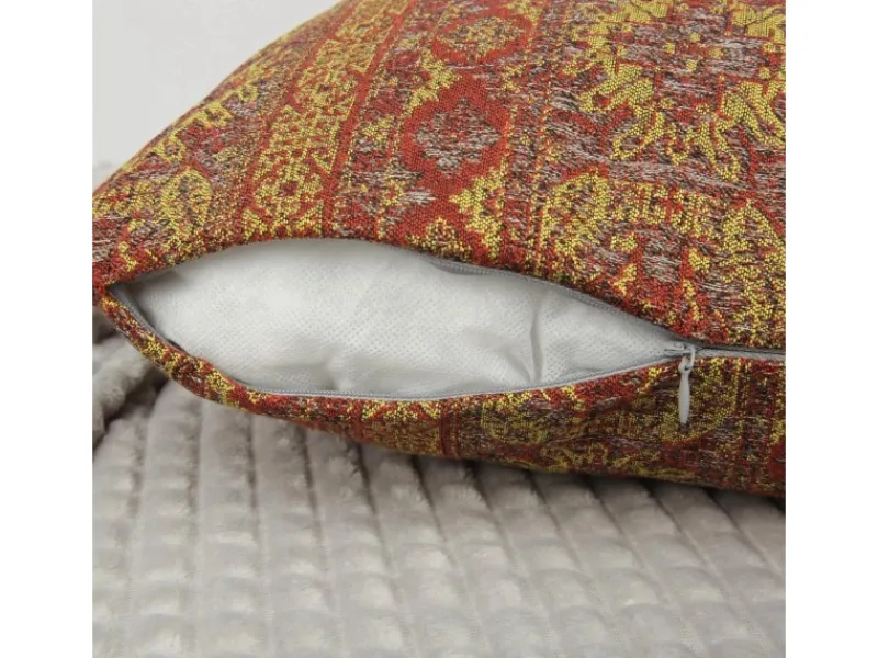 Lieferumfang: Ein Dekokissen in der Größe 45x45cm mit Palmenblatt Druck auf Vorder- und Rückseite in der Farbe Ziegel, bei 30° in der Maschine waschbar