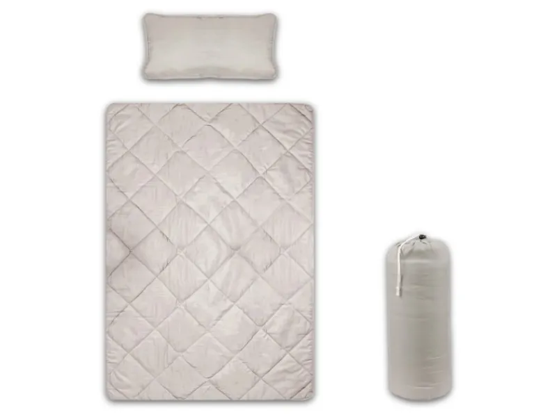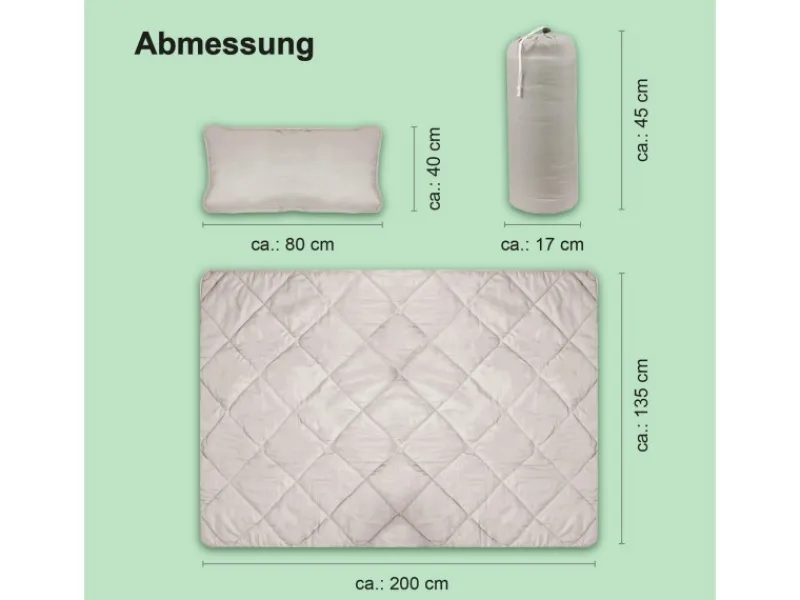 Inklusive einer 135x200cm Steppdecke und einem 40x80cm Kissen für unterwegs