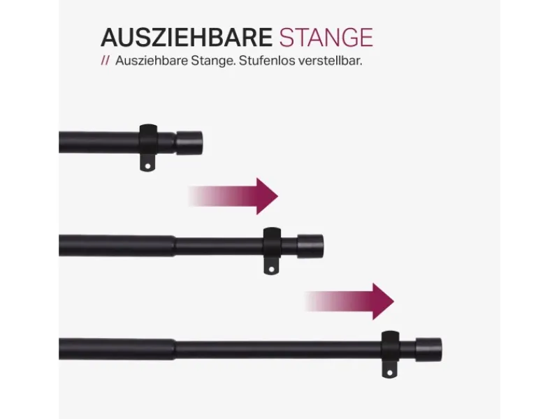 LIEFERUMFANG – 1x Stilgarnitur ausziehbar inkl. Ringe mit Faltenlegehaken, Montageanleitung und Befestigungsmaterial (22x Ringe, 22x Vorhanggleiter, 6x Schrauben, 6x Dübel, 3x Faltenlegehaken, 3x Wandträger).