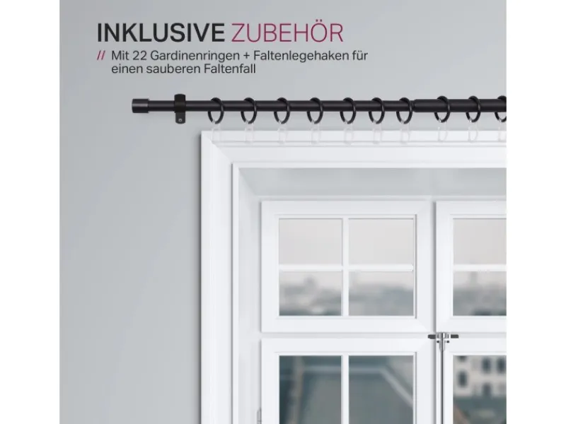 VIELSEITIG – Durch die Im Lieferumfang enthaltenen Ringe mit Faltenleghaken können Sie an dieser Vorhangstange auch ohne weiteres Gardinen mit Universalband/Kräuselband befestigen. Selbstverständlich können Sie ohne die Ringe auch Ihre Schlaufenschals oder Gardinen mit Ösen aufhängen.