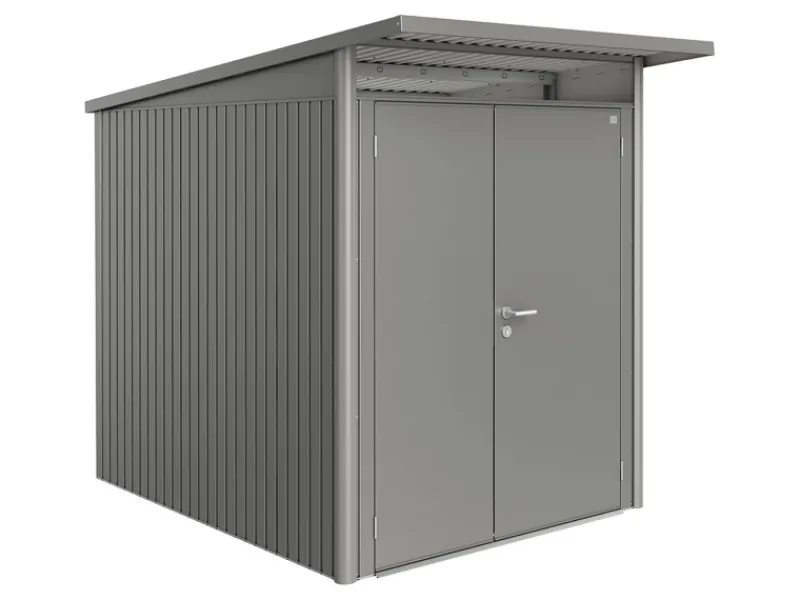 Das Gerätehaus aus Metall überzeugt durch sein modernes Design und ist dabei in der Farbe Quarzgrau-Metallic gehalten.