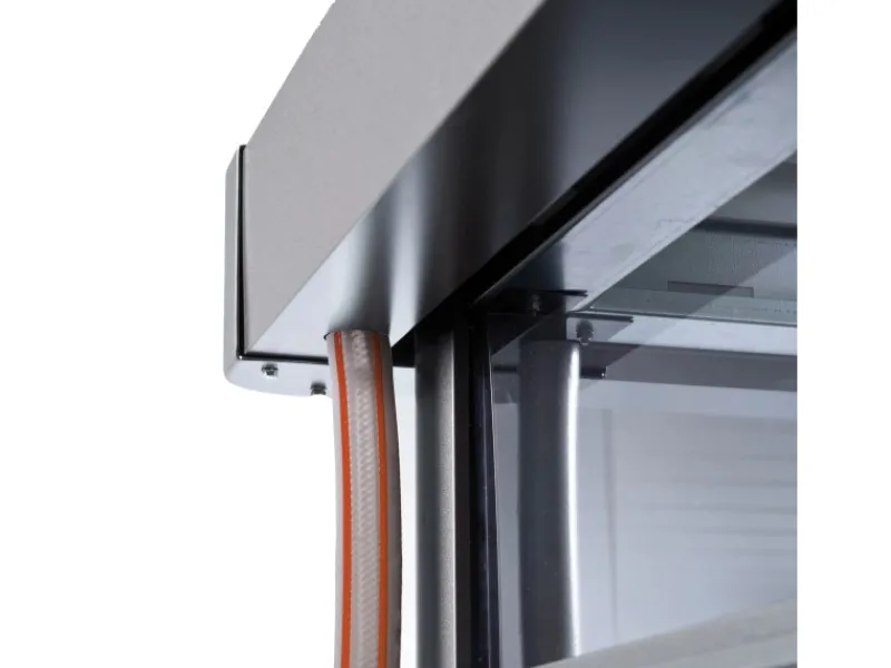 Moderne Oberlichter aus Acrylglas sorgen für ausreichenden Lichteinfall. Integrierte Ventilationsschlitze dienen zur Belüftung. Die großzügige Doppeltür ermöglicht das bequeme Betreten auch mit größerem Gerät. Die Tür verfügt über eine modernen Edelstahl-Drückergarnitur und ist mit einer robusten Dreifach-Verriegelung gegen abschließbar. Das Öffnen und Schließen der Tür wird mittels Gasdruckfeder erleichtert. Die seitlich angebrachten Dachrinnen verfügen über einen 5/4″-Gartenschlauchanschluss und integrierten Laubfänger.