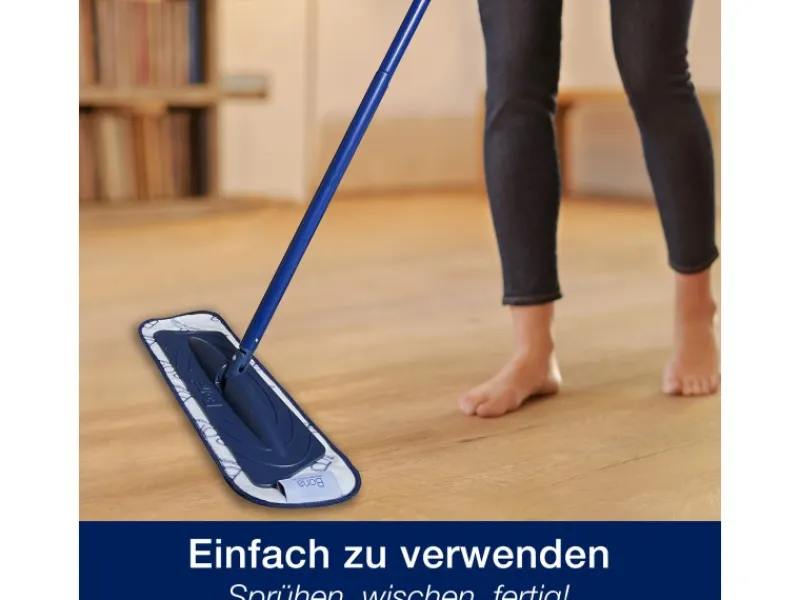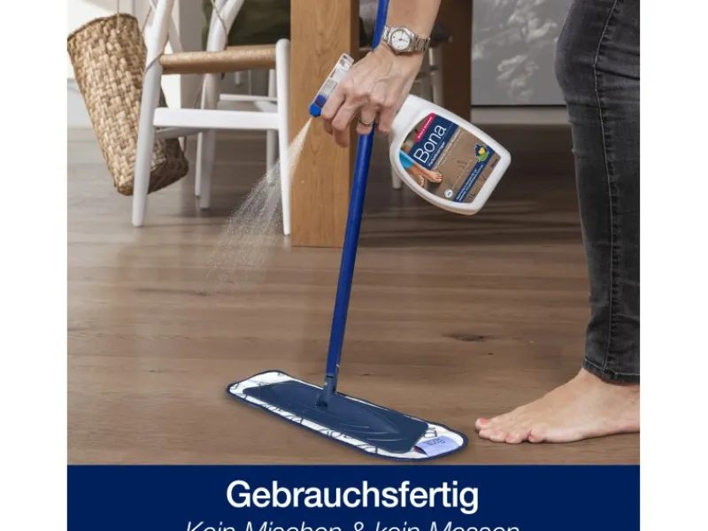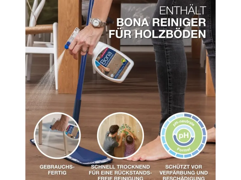 Das Bona Parkett-Reinigungsset ist ein Starter-Set für eine streifenfreie Reinigung von lackierten und gewachsten Holzböden. Flecken, Schmutz und Verunreinigungen lassen sich damit gründlich entfernen. Für alle Holzböden geeignet.Herkömmliche Reinigungspads nehmen Staub und Schmutz oft nicht richtig auf und hinterlassen Rückstände. Das Bona Mikrofaser-Reinigungspadzeichnet sich durch sein einzigartiges Zwei-Zonen-Design aus. Die dunkelblauen Außenfasern lösen den Schmutz schonend, während die hellblauen Innenfasern den Schmutz aufnehmen. Der Wischbezug ist maschinenwaschbar und lässt sich durch seine Klettoberfläche an allen Bona Mopps befestigen.Der wasserbasierte Bona Parkettreiniger wurde speziell für die regelmäßige Reinigung lackierter oder gewachster Parkettböden entwickelt. Die spezielle Streifenfrei-Formel hinterlässt keine klebrigen Rückstände und beseitigt selbst gröbsten Schmutz und starke Verunreinigungen gründlich. GREENGUARD-GOLD-zertifiziert, mit sehr niedrigen VOC-Emissionen.Der Reiniger ist auf Bona Parkett Refresher, Bona Polish und viele andere Oberflächenbeschichtungen abgestimmt. Das Bona Parkett-Reinigungsset besteht aus einem Wischmopp, dem Bona Mikrofaser-Reinigungspad und dem Bona Parkettreiniger 1 L. Einfach auf den Boden sprühen und wischen.