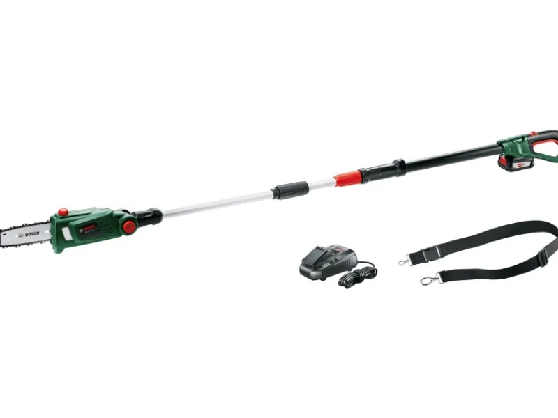 Der Bosch Akku Teleskop-Kettensäge UniversalChainPole 18 schneidet Äste mit seiner schnellen Kettensäge und lässt sich mit seinem 18-V-Akku kabellos im Garten einsetzen. Durch Verlängern des Teleskopstiels und der praktischen Neigefunktion des Kopfteils, kanns du Äste sägen, die du sonst nur schwer erreichen würdest.