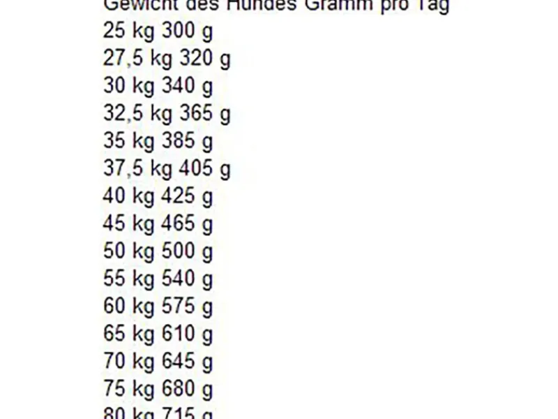 Diese Angaben sind Richtwerte. Der individuelle Bedarf hängt von Faktoren wie Alter, Rasse, Aktivität und Haltungsbedingung ab. Bei gesteigerter Aktivität bitte Futtermenge entsprechend erhöhen.