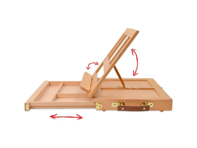 Die Kofferfunktion besitzt eine Schublade mit 3 Fächern zur Aufbewahrung Ihrer Malutensilien.Aus BuchenholzDie Kofferstaffelei ist komplett aus massivem Buchenholz gefertigt und kann ebenfalls als Zeichenbrett verwendet werden.