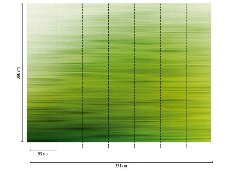 Die Maße dieser Fototapete sind 371 x 280 cm (Breite x Länge). Das Motiv dieser Fototapete kann horizontal wiederholt werden, damit mehrere Fototapeten nebeneinander geklebt werden können. Diese Fototapete besteht aus 7 Paneelen mit einer Breite von 53 cm.