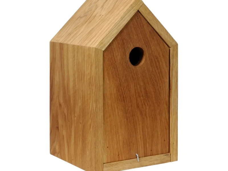 Der Design-Nistkasten mit Spitzdach in modernem Look ist aus imprägniertem, massivem EU-Eichenholz gefertigt. Der Innen-Korpus ist komplett herausziehbar und ermöglicht somit eine einfache und praktische Reinigung. Das Einflugloch beträgt Ø 32 mm. Das gebohrte Loch an der Rückwand ermöglicht ein einfaches Befestigen an Bäumen oder Wänden.