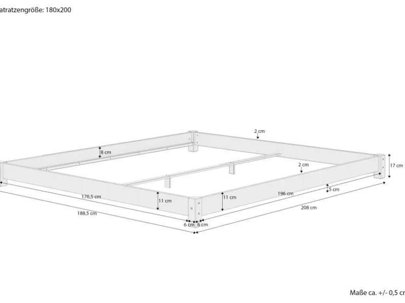 Sehr stabiles Massivholz-Bett 180×200 – in besonders niedriger AusführungAuch geeignet für Gästehäuser, Pensionen, Ferienwohnungen, Kinderzimmer oder Schlafzimmer mit MansardeNaturprodukt Holz… logisch!Beschreibung:Das schlichte, sehr stabile Einzelbett (180×200 cm) aus massivem Kiefernholz bietet einen erholsamen, ruhigen Schlaf.Besonders ideal für kleine Kinder, die oft aus dem Bett fallen – durch die niedrige Rahmenhöhe wird die Verletzungsgefahr deutlich reduziert.Jedes unserer Echtholzbetten hat eine einzigartige Maserung und ist somit ein echtes Unikat.Das verwendete Holz stammt aus europäischen, schonend bewirtschafteten Wäldern – selbstverständlich ohne den Einsatz von Fremdstoffen.Die Montage ist schnell und einfach dank beiliegender Aufbauanleitung.Das Bett ist ideal für Zimmer mit niedriger Deckenhöhe, wie z. B. Mansarden, kleine Kinderzimmer, Gästezimmer oder minimalistisch eingerichtete Räume.Die hochwertige Klarlack-Versiegelung schützt das Holz und erleichtert die Reinigung – einfach mit einem feuchten Tuch oder Staubwedel abwischen.Trotz der kompakten Bauweise ist das Bett äußerst belastbar – die statische Tragkraft liegt bei bis zu 120 kg.Maße:Liegefläche: 180 x 200 cmLänge Seitenbrett zwischen den Pfosten: 200 cmAußenmaße: ca. 188,5 x 208 x 17 cm (B x L x H)Pfostenstärke: ca. 67 x 67 mmSeitenbretter: ca. 20 x 110 mmEinlegetiefe: ca. 8 cmHöhe der Bettkante: ca. 17 cmBodenfreiheit unter dem Bett: ca. 5 cmGesamtgewicht (ohne Zubehör): ca. 11 kg