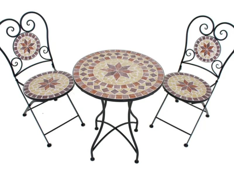 Die kunstvoll eingearbeiteten Steingutscheiben in sandfarbenen Tönen, von Beige bis zu roten Ockertönen, bilden einen faszinierenden Kontrast zu den geschwungenen Bögen des schwarz lackierten Stahlgestells. Die Tischplatte, die Sitzflächen und die Rückenlehnen sind mit diesem ansprechenden Mosaik verziert und verleihen dem Set seinen mediterranen Charme.